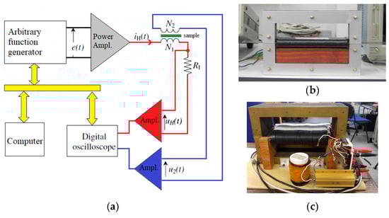 Figure 1a depicts the measuring circuit diagram, in which the main idea is to impose a predetermined sinusoidal time variation of the magnetic polarization J, proportional to the secondary voltage u2(t) through a recursive technique. At the first step, the e(t) waveform is provided by the arbitrary function generator that has as output the J(H) dependence. The component J(t) of the hysteresis dependence is not sinusoidal, so that a new iH(t) waveform is computed and an updated e(t) function is given. The process is recursively controlled until the form factor criteria imposed on J(t) variation is met [14,27].