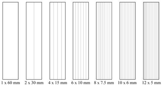 For the second study, medium quality (M400-50A and M400-65A) and high quality (NO20 and M300-35A) steel samples were considered. The strips were cut through mechanical punching, using the Krrass Q11-2X2500 Machine, and trough water-jet technology, by means of a Maxiem 1530 device. The width w of the strip was chosen equal to 5, 6, 7.5, 10, 15, 30, 60 mm, respectively, and the length was kept constant at 300 mm. In order to reconstruct the width of 30 mm (for M400-50A and M400-65A) and of 60 mm (for NO20 and M300-35A), several identical strips were placed side by side, as shown in Figure 2. This procedure allows an accurate analysis of the influence presented by the cutting perimeter increase in which energy losses and magnetic permeability are concerned.