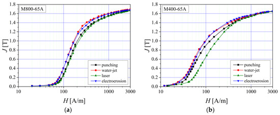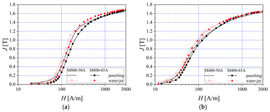 Normal magnetization curves of M400 electrical steel grade, in the case of different sample thickness (0.50 mm (a) and 0.65 mm (b)) and two cutting technologies.
