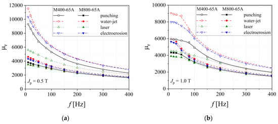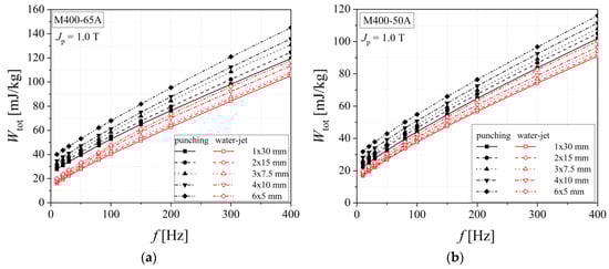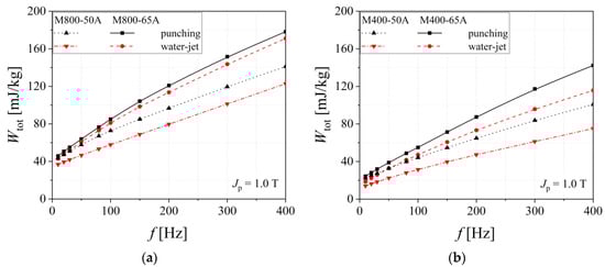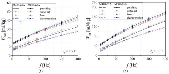 Total energy loss versus frequency dependencies of electrical steel grade M400-65A (a) and M400-50A (b), in the case of two cutting technologies.