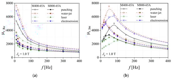 Relative magnetic permeability versus frequency dependencies of electrical steel grade M400-65A (a) and M400-50A (b), in the case of two cutting technologies.