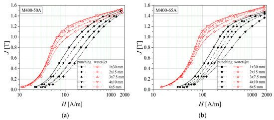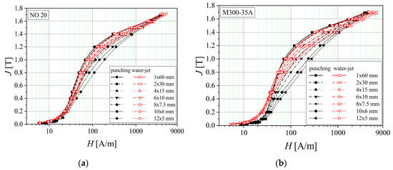 Figure 9 shows that by decreasing the analyzed strip width, the magnetization process becomes increasingly difficult. For the water-jet cutting, the experimentally obtained normal magnetization curves show that lower values of the excitation field are required than those necessary in the case of punching technology for obtaining the same magnetic polarization value. At the saturation point, the reduced thickness (0.50 mm) of the samples results in an overlapping of the normal curves.