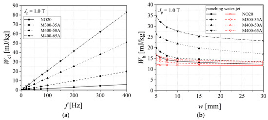 The total energy loss was analyzed according to the statistical theory of losses, which considers its decomposition into classical (eddy currents), hysteresis, and excess loss components [14]. The classical energy loss Wcl is associated with the macroscopic eddy currents, which are present in the close proximity of the sheet surface. Eddy current loss is computed on the basis of the strip thickness, resistivity, and density, being directly proportional to the working frequency at a given magnetic polarization value [40]. Under these assumptions, the classical loss may be considered as invariable with regards to the cutting technology, as shown in Figure 13a. In the case of electrical steels, the C content has to be limited to 0.01%, so as not to favor the slow precipitation of iron carbides, which leads to higher energy loss. The iron carbides determine a hysteresis loss increase and a reduction of the relative permeability. The decarburization treatment induces a diminution of the C content and a decrease of the residual stresses through the generation of an oxide layer on the alloy surface. A secondary re-crystallization, combined with grain size growth, leads to a better crystallographic texture. Sulfur is usually considered an impurity in the electrical steel manufacturing process, because during solidification, S reacts with Mn, forming inclusions of manganese sulfide (MnS). A S decrease content determines lower energy losses. The investigated alloys have the S percentage comprised between 0.003% (M400-65A, M400-50A) and 0.004% (M300-35A, NO20). Nitrogen reacts with Al and the resulted AlN particles, which as well as MnS, hinder the magnetic domain wall movement. If they are thin, an inhibition of the grain growth is observed, during the electrical steel decarburization step [41,42]. The hysteresis energy loss (see Figure 13b) was computed by extrapolating the total energy loss values as a function of frequency toward zero. The highest hysteresis loss was determined in the case of M400-65A, for the punched 5 mm width strip, being equal to 35 mJ/kg, whereas the lowest value of 12 mJ/kg was found in the case of the NO20 water cut 60 mm width sample.