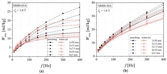 The influence of the cutting procedure on the dynamic energy loss, that represents the sum of classical and excess components in the 3 Hz–400 Hz frequency range, is put in evidence by representing the excess loss component versus frequency, in good accordance with the statistical theory of losses. This links the strain hardening effect generated by cutting to the statistics of the local coercive fields, and the final result is an increased value of excess loss. In the case of medium quality M400-65 alloy, the excess loss is lower than that obtained for M400-50A steel, because of the larger grain size and the higher Si content (2.19% for the 65 mm and 1.99% in the case of 50 mm thickness alloy) (see Figure 14). The P content ratio was kept to 0.021% for both materials.