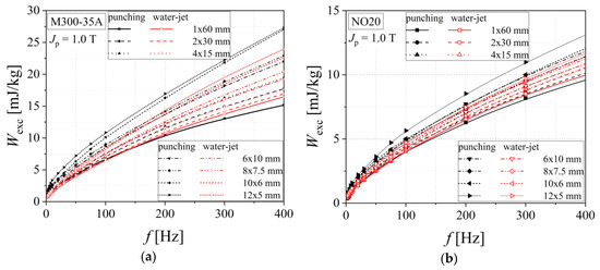 Total energy loss versus frequency dependencies of electrical steel grade NO20 (a) and M300-35A (b), in the case of two cutting technologies.