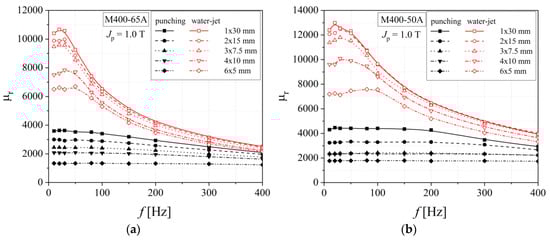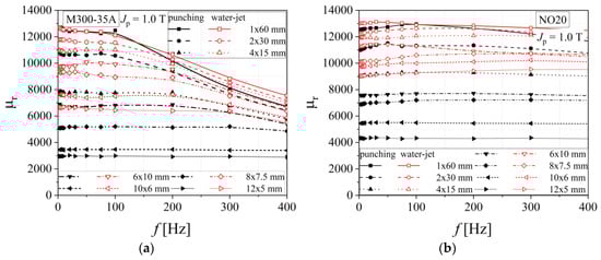 It is commonly accepted that an industrial grade with a medium silicon content (M400-65A) and with low energy loss has a lower coercive force and saturation polarization and a higher relative magnetic permeability. These alloys exhibit an important anisotropy of magnetic permeability, the highest values being obtained if the exciting magnetic field is applied parallel to the rolling direction [35]. The high magnetic permeability materials could be obtained, by slightly modifying the metallurgical process, by controlling the so-called dilution factor between magnetic alloy and austenitic phase steel (non-magnetic material) and by maximizing the average value of the permeability in the working zone of the device [35,36,37]. In the case of both analyzed non-oriented electrical steels, the relative magnetic permeability has a descending variation as the measuring frequency increases (Figure 7). Higher values are obtained for M400-65A alloy in the case of water-jet technology. It can be noticed that for the M800-65A grade, the cutting technology has an important influence at frequencies lower than 200 Hz, below these values the cutting technology presents a minimal effect.