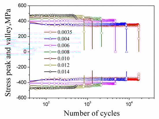 Cyclic stress peak and valley versus the number of cycles at different amplitudes.