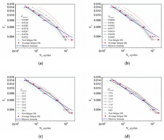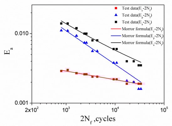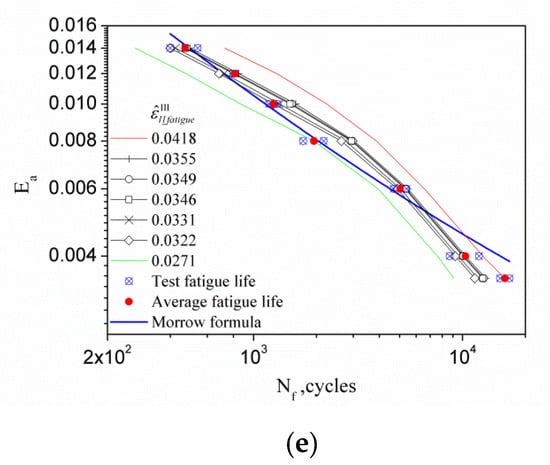where , , and denote the elastic, plastic, and total strain amplitudes, respectively; while and b are elastic fatigue constants known as the strength coefficient and exponent, respectively; and and c are the ductility coefficient and exponent, respectively. The coefficients in these formulas can be obtained by fitting the experimental data in Table 3, which are = 1368.01 MPa, b = −0.124, = 0.313, and c = −0.485, respectively. The test data and the Morrow curves are all presented in Figure 5.