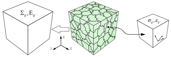 where is the amount of the elements in the RVE; and are the mesoscopic Cauchy stress tensor components and logarithmic strain tensor, respectively; the subscript k is the sequence number of the finite element; and , where denotes the volume of the kth element and V the total volume of the RVE.