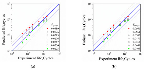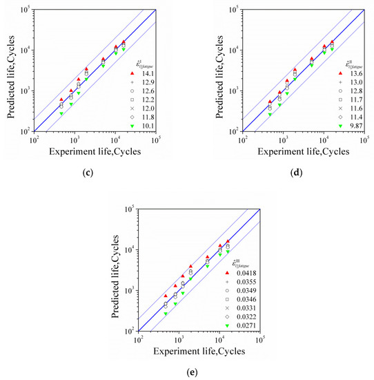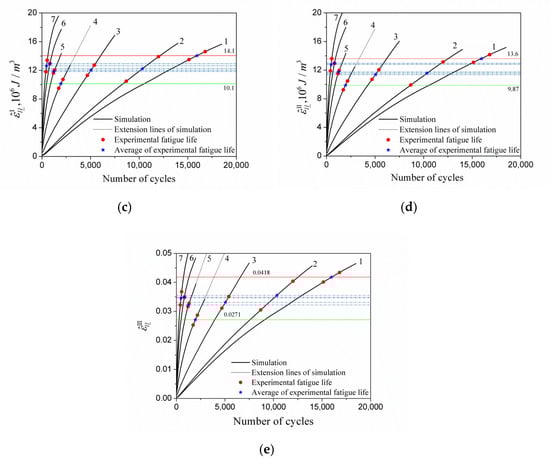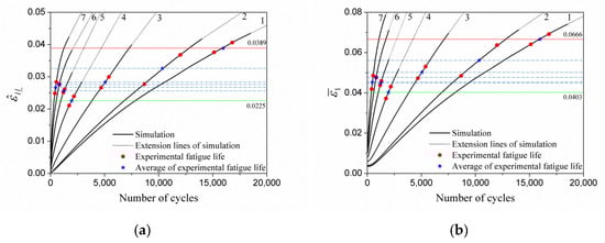 The vertical coordinate value of the blue star point of the corresponding curve in Figure 10 is regarded as the approximate critical value of the corresponding parameter. A horizontal line can be drawn through the point. The intersected point of the horizontal line and the parameter curve of other strain amplitude cycles by simulation is the predicted life of the corresponding strain amplitude cycle. Therefore, according to the fatigue test of any strain amplitude, the fatigue life of the cyclic loaded specimen at other strain amplitudes can be predicted through Figure 10. The prediction of fatigue life based on parameters , , , , and is listed in Table 6, Table 7, Table 8, Table 9 and Table 10.