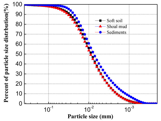The sediments used in the experiment were taken at depths of 0.3 to 2 m below the bed of the Qiantang River in the city of Ningbo, China. They were in the form of slurry, composed of sediment clays in a grey to black color, and with an organic (i.e., fulvic acid) content of 2.5%. The particle size distribution of the sediment (size range: 0.3~5000 nm), which was determined using a Malvern Zetasizer NanoS90 laser particle size analyzer (Malvern, UK), is presented in Figure 1. For comparison purposes, Figure 1 also includes two typical soft soils in Ningbo. The test sediment shows the similar particle size distribution pattern to the typical soft clays in the region, but has a slightly higher fines contents. The clay fraction (≤2 µm) of the sediment accounts for 23%.