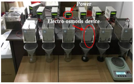 The electro-osmosis device was installed as in Figure 2. It mainly comprised of a test tank (180 × 120 × 130 mm), a metal electrode (120 × 130 × 3 mm), and power. According to the characteristics of the electroosmotic migration of pollutants in the soil [28,31], the stability of electro-osmosis and the same displacement of the electro-osmosis terminal point in the early stage are controlled by the constant current stability.