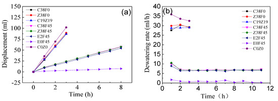 Figure 4 shows that electro-osmosis was carried out by means of a constant flow of electricity, and the dewatering rate of different groups basically remained stable, while the concentration of heavy metals and volume of the solution were controlled at the same level, comparing the displacements and dewatering rates of different groups. Figure 4a shows that the displacements of groups C38F0, Z38F0, and C19Z19 are 87.1, 89.4, and 86.6 mL, respectively, and the displacements of groups C38F45, Z38F45, and E2F45 are 78.6, 77.7, and 73.9 mL, respectively. Meanwhile, as shown in Figure 4b, the dewatering rates of groups C38F0, Z38F0, andC19Z19 is about 29 mL/h. It could be concluded that the types of heavy metals have little effect on the displacement and dewatering rate. At the same time, comparing the dewatering rates of groups C38F0 and C38F45, Z38F0 and Z38F45, C19Z19 and E2F45 doped with fulvic acid or not, it was found that C38F45 decreases by about 77.6%, Z38F45 decreases by about 78.5%, and E2F45 decreases by about 78.2%, which indicates that the addition of an electrolyte under a constant current caused the decrease of the dewatering rate, and the effect of fulvic acid was contrary to that of chemical solutions (i.e., phosphate, aluminiumions, and phosphoric acid). It was found from the literatures [42,43] that the injection of chemical solutions during electro-osmosis were effective in enhancing the electro-osmosis and increasing the undrained shear strength of soil. Besides, the effect of electro-dewatering is related to the electrode types, electrode arrangement, and electrified methods.