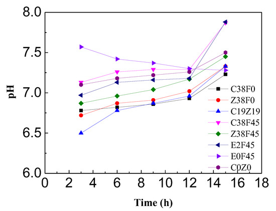 The red dot line in Figure 5 is the pH value (7.25) of the sediment before electro-osmosis treatment. The previous results show that the decrease of the pH value is beneficial to the dissolution of metals into water [44]. In this study, group E0F45as the control group without being energized, and the pH remains at the original value (7.25) after 15 h. Except for group E0F45, the pH values in different groups tended to increase near the cathode, which was caused by a redox reaction in the soil under the condition of electrification, generating H+ ions near the anode (Equation (2)) and OH− ions near the cathode Equation (3):