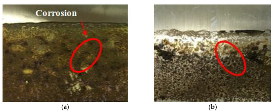 Electrode corrosion (a) Sample with no fulvic acid; (b) Sample mixed with fulvic acid).