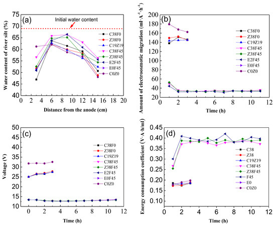 Figure 7d shows that the average energy consumption coefficient of group A (C38F0, Z38F0, and C19Z19) in the early stage of electro-osmosis is only 0.18 VAh/mL, and the average energy consumption coefficient of group B (C38F45, Z38F45, and E2F45) is 0.37 VAh/mL, while the average equivalent voltage of group A is twice as much as group B, indicating that the energy consumption coefficient of the electroosmotic process is controlled by the equivalent voltage, regardless of the type of electrolyte.