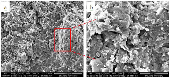 From the micrographs of pores and hydration products, it can be inferred that organics have an influence on the inhibition of hydration reaction. The main reason is that fulvic acid can be combined with aluminum and calcium produced by cement hydration, delaying the progress of cement hydration, and simultaneously decomposing hydration products, hindering the hardening of cement, and thus affecting and destroying the formation of solidified soil structure and strength [18,19,20,21].