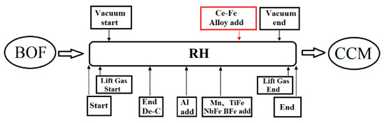 During vacuum circulation degassing refining (RH) treatment, the limit vacuum degree was ≤0.106 Kpa, and the total vacuum treatment time was 30 min. Due to the strong oxidizability of rare earth, in order to avoid the oxygen oxidation brought on by other alloys during the alloying process, and to ensure the effective boron content in the steel, after aluminum deoxidization, the addition sequence of the alloy in the RH vacuum treatment process was ferromanganese, ferrotitanium, ferroniobium, and ferroboron. The 120 kg rare earth ferrocerium alloy (Ce content was 10%) was added at 3 min after alloying. After RH treatment, the sedation time was more than 15 min to ensure the inclusion would fully float. The recovery rate of rare earth Ce was 51%.