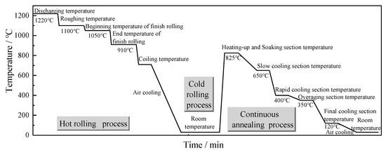 The sampling positions of strips in hot rolling (HR), cold rolling (CR), and continuous annealing (CA) correspond to the slab positions, which were 1/4 of the width direction of the plate. The sample sizes were 4.3 × 10 × 10 mm3, 1.15 × 10 × 10 mm3, and 0.7 × 10 × 10 mm3.