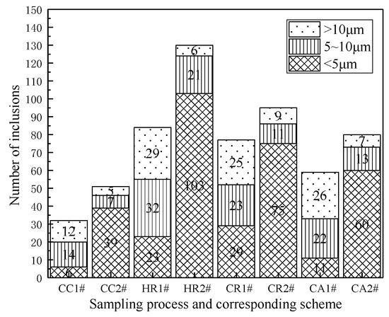 Figure 3 shows the number of inclusions in different size ranges under corresponding processes and schemes. The amount of inclusion with CC, HR, CR, and CA process greater than 10 μm under the statistical field of view of sample 1# group were 12, 29, 25, 26, respectively. The sample 2# group were 5, 6, 9, and 7 respectively. The proportion of inclusions less than 5 μm in each process of sample 1# group were 18.7%, 27.4%, 37.7%, and 18.6%, respectively. The sample 2# group were 76.5%, 79.2%, 78.9%, and 75%, respectively. It can be seen that the inclusion scale decreased and the number of inclusions increased obviously in the whole casting and rolling process after adding rare earth.