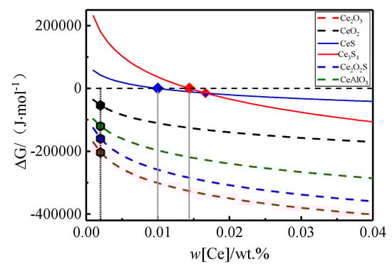 Table 2 shows the chemical reactions related to the addition of rare earth to the molten steel and the standard Gibbs free energy [11,12]. According to the reaction and the activity coefficient of each element in the molten steel, the Gibbs free energy of production of each rare earth inclusion at 1873 K was calculated as shown in Figure 4. It can be concluded that when the content of wt.% Ce in the rare earth was less than 0.01, only CeAlO3, Ce2O3, Ce2O2S, and CeO2 were generated in the molten steel. When the content of wt.% Ce was greater than 0.01, CeS, Ce3S4, and other inclusions were successively precipitated out. As the alloying and solidification process of molten steel is unsteady, there may be different contents of inclusions, such as Al-O-Ce and S-O-Ce, in the steel [13].