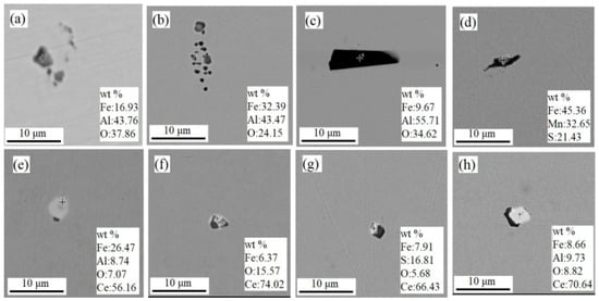 According to the statistics of the number, size, and proportion of all kinds of inclusions in the samples of casting and rolling process by ASPEX-SEM, the main types of inclusions in the samples 1# are Al2O3, Al-O-Ti, TiN, MnS, silicate, etc. The inclusions in the samples 2# are mainly Al-O-Ce, Ce-S-O, Ce-O, Al2O3, Al-O-Ti, TiN, MnS, etc.