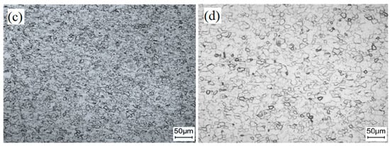 Figure 6 is the comparison of microstructure and grain size detection of a strip in each rolling process. It can be seen that the microstructure was ferrite, the grain of sample 1# obviously had a certain orientation, grain growth was not enough, the structure was not fully recrystallized, some grains were isometric, and a small part of grains were long strip. The grain of sample 2# were more uniform than sample 1#. After annealing, the structure realized complete recrystallization, and the grains grew more evenly, all of which were transformed into equiaxed grains. After the test, the grain sizes of sample 1# were 7 and 9.5, and the sample 2# were 8.5 and 11. The results show that the structure of the strip was more uniform and compact, and the grain size was finer.