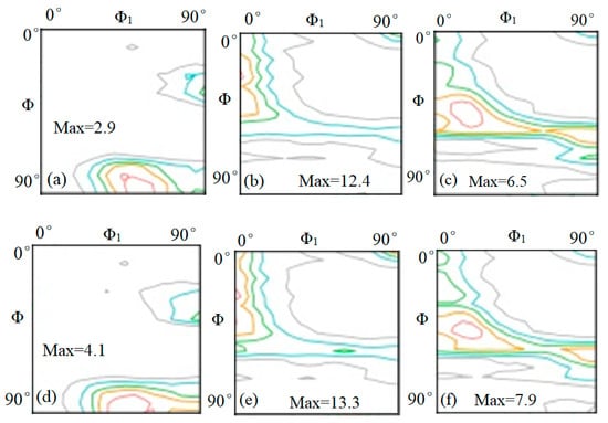 The ODF cross section (Ф2 = 45°) in the rolling process. 1#: (a) HR, (b) CR, (c) CA. 2#: (d) HR, (e) CR, (f) CA.
