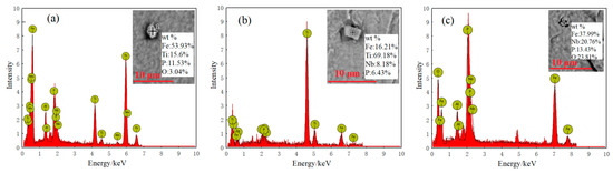 Figure 8 shows the typical Fe(Nb+Ti)P precipitates of the sample 1# observed by SEM in the rolling process. It can be seen from the figure that the types were FeTiP, Fe(Nb+Ti)P, FeNbP, etc., with the size range of 1–3 μm. No inclusion of this type was found in each field of view in the sample 2#. The strength of IF steel containing phosphorus was mainly enhanced by the solution strengthening effect of phosphorus. However, it was easy for phosphorus that precipitated in the precipitated phase of FeTiP to cause the grain boundary brittleness of steel due to grain boundary segregation. In the process of annealing and recrystallization, FeTiP played a role of a pinning effect on the grain boundary, hindered the growth of {111} oriented grains, and weakened the γ texture strength, which is harmful to the r value [30,31,32]. In addition, the precipitation of Fe(Nb+Ti)P will also consume solid solution P element, reduce the strength of the strip steel, consume Ti element, increase the interstitial atom C, N, and damage the formability of the material [33,34].