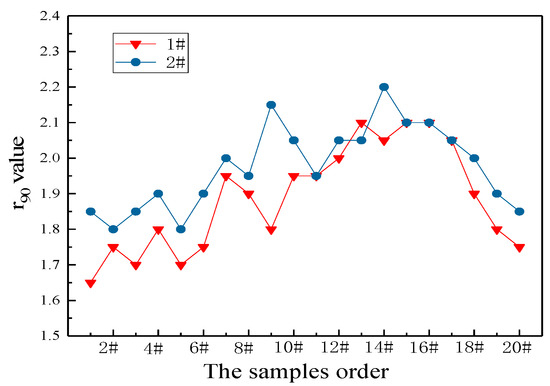 The excellent deep stamping properties of IF steel mainly come from its {111} texture. Table 3 shows the statistics of the favorable texture content of the strip detected in each rolling process. It can be seen that the sample 2# percentage contents of the favorable texture {110} <001> in the HR process and {111} (< 110 > + < 112 >) in the CR and CA processes were 5.78%, 22.7%, and 24.16% respectively, which were greater than sample 1# (3.79%, 18.8%, and 21.62%) in the corresponding processes.