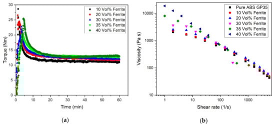Compounds consisting of ABS as polymer matrix, stearic acid as surfactant and increasing amounts of barium ferrite were prepared by a mixer-kneader with torque recording. Following earlier investigations [16,17], a huge solid load (denoted as vol.%) is targeted to achieve significant property changes. Due to the large ferrite density (5.4 g/cm3) a high ceramic weight content is necessary to obtain a huge volume content, e.g., 35 vol.% is equivalent to 72 wt.%. As known from previous investigated composites with e.g., ABS as polymeric host, the torque increases with increasing solid load [16,17] (Figure 2a). The measured compounding curve can be split into three different time regimes, roughly [23]: In the first 5–7 min (filling state) all components (ABS, ceramic and dispersant) are added, as described in the experimental section. The filling state is characterized by a huge initial torque values due to direct particle-particle interaction. The first regime ends with the complete addition of all components and delivers non-specific maximum torque values. In the second regime (mixing state), the particles deagglomerates and are wetted by the surfactant, delivering a pronounced torque drop. Finally, a steady state (equilibrium state) is reached with a complete wetting of the ceramic particles by the surfactant and the polymer. Increasing solid loadings extend the filling time, which can be depicted from the compounding time until the maximum torque value is reached. With respect to composite homogeneity, the numerical value of the maximum torque is without any particular meaning for the final composite homogeneity as described earlier [23]. An increase of the solid load causes an increasing particle–particle interaction delivering higher equilibrium torque values according to enhanced inner friction. Comparable results can be derived from the rheological investigations (Figure 2b). Pure ABS and all composites show a pronounced pseudoplastic flow, which means a significant viscosity drop with applied shear rate at constant temperature. Especially at shear rates below 100 1/s increasing ferrite load causes a pronounced viscosity increase shifting the zero shear viscosity to smaller shear rates and higher viscosities [24]. This pseudoplastic flow behavior is favorable in injection molding due the large injection pressure and injection speed, but adverse for the more or less pressureless FFF. Typical feedstocks used in ceramic injection molding with a solid load around 50 vol.% show at injection temperature and realistic shear rates larger than 1000 1/s viscosity values smaller than 100 Pa·s [25]. In case of FFF typical shear rates are in the range of 50–200 1/s depending on the used extrusion nozzle and printing speed at the given printing temperature [26]; hence viscosity values around 500–1000 Pa·s are realistic even for composites with low filler load. From the measured viscosities values it can be expected, that with increasing ferrite content FFF printing could be difficult.