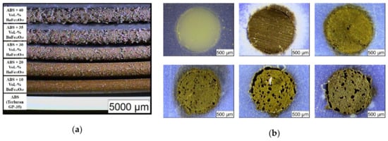 Microscopic images: (a) extruded filaments with different solid loadings; (b) polished cross-sections with increasing filler content: 1. Row: Pure acryl butadiene styrene (ABS), 10 vol.%, 20 vol.% ferrite, 2. Row: 30 vol.%, 35 vol.% and 40 vol.% ferrite.