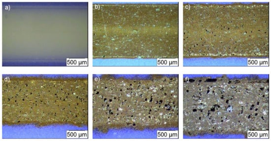 Microscopic images of polished longitudinal cuts with increasing filler content: Upper row, from left to right: Pure ABS (a), 10 vol.% (b) and 20 vol.% (c); lower row: 30 vol.% (d), 35 vol.% (e) and 40 vol.% (f) ferrite.