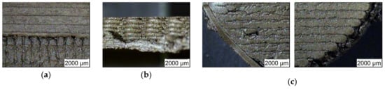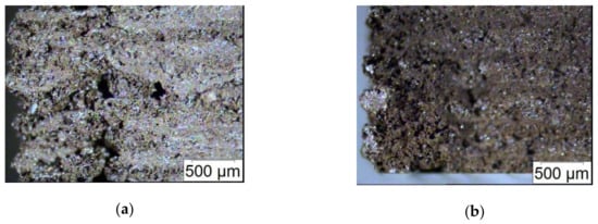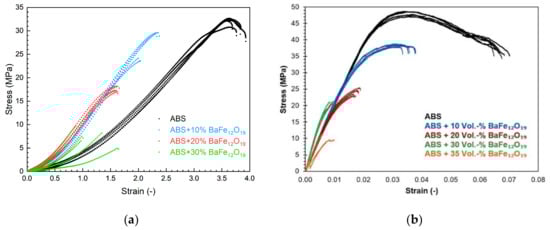Figure 7 shows the results derived from tensile (a) and bending tests (b), furthermore Table 2 lists the accessible ultimate stress as function of the ferrite load in the composite. Increasing solid loadings have a certain impact on the mechanical properties: First the tensile strength is reduced, also the ultimate stress and ultimate strain. Second and especially obvious in case of the composite with 30 vol.% ferrite, the measurements show some scattering. The measured stress–strain behavior is a superposition of two effects: On the one hand the particles act as discontinuities in the polymer matrix, on the other hand the printing process itself generates defects in the specimen. Both mechanisms delivers a non-homogeneous bulk material with some property scattering. A closer view on the bulk material show, that both typical type of defects—voids within one layer as well as between layers and delamination of printed layers—can be found in the specimen (Figure 8). This is in agreement with results also published for FFF-fabricated magnetic composites [31,32]. The highly filled specimens are very fragile to mechanical stress, so in case for future applications as magnetic composite a stress-free environment must be selected.