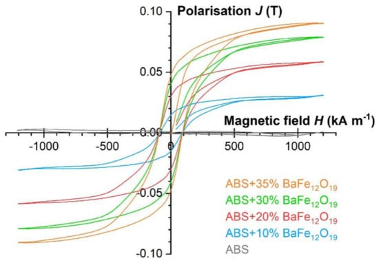 All measured magnetic properties as function of the barium ferrite are summarized in Table 3. Though only one sample was investigated per composition, a clear correlation between solid load and magnetic response is detectable, also the hysteresis under magnetization (Figure 9). The absolute values for the remnant flux density Bremn, the polarization Jmax as well as for the energy product (BH)max are moderate even for the highest ferrite content, which can be attributed to the huge number of voids in the samples.