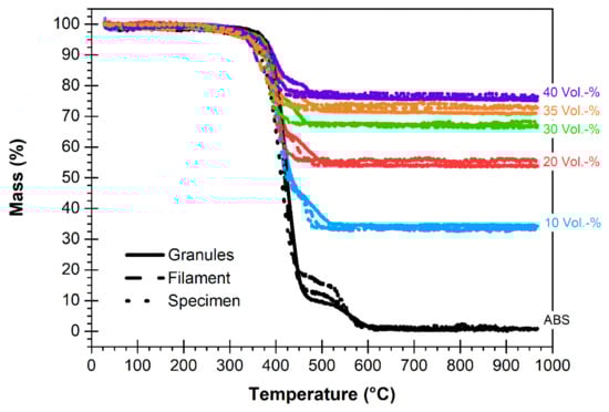 With respect to the development of a robust process, it has to be proved that the different individual manufacturing steps do not alter the initial balanced composite’s solid load. The ferrite content was measured by thermal analysis after pelletizing, filament formation and finally FFF printing. Figure 10 shows the temperature dependent weight loss of all investigated composites and the polymer matrix ABS as reference. In all cases, the main polymer decomposition occurs in the temperature range between 350 and 450 °C. Within the experimental error no relevant deviation of the solid load during processing can be detected, increasing ferrite amounts may cause a slightly reduced polymer decomposition temperature. In the temperature range between 450–550 °C, an influence of the processing can be observed even for the pure polymer matrix; one has to consider, that during manufacturing each processing step means a high additional thermal stress (compounding: 210 °C, rheological measurement: 240 °C, filament fabrication: 210 °C and printing: 220–240 °C), which may accelerate thermal decomposition.