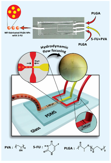 To overcome these problems, microfluidic (MF) systems with the ability to manipulate and controlling fluids in the range of picoliters to microliters have turned into emerging and efficient tools for the improvement of drug delivery systems. Compared to conventional batch methods, the MF setup has many advantages: better control of material characteristics, precisely controlled release profiles of payloads and high reproducibility, in addition to performing multiple and concurrent assays on the chip [17,18,19,20]. Thus, studies of MF systems as a nanosuspension bottom-up approach have focused increasingly on the fabrication of drug carriers and direct drug delivery to a targeted tissue [21,22,23]. For this reason, the early study on 5-FU release in the MF system with cross-junction microchannel showed that the drug-loaded genipin-gelatin microcapsules produced using this technique had a narrow size distribution with a particle diameter in the range of 130–580 µm [24]. Moreover, Xue et al. [25] worked on the production of 5-FU-loaded biocompatible poly (ethylene glycol) diacrylate microspheres with MF device pattern of T-junction channel that resulted in a monodispersed size distribution from 16.7 to 85.7 µm in diameter, leading to utilizing for sustained drug release. Wang and coworkers [26] synthesized a dual drug-loaded magnetic alginate microsphere containing 5-FU and doxorubicin hydrochloride using MFs, combined with an external ionic crosslinking. Their results exhibited a uniform size of microspheres, excellent vision under magnetic resonance and regular spherical shape. Therefore, the characterized dual drug-loaded microspheres could be used in the integration of chemotherapy diagnosis with a combined modality potentially.