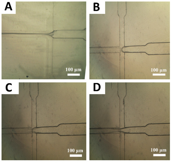 Effect of flow rates ratio (Qpolymer/Qdrug) on the production of poly (lactic-co-glycolic) acid (PLGA) droplets: (A) 10, (B) 5, (C) 3.3 and (D) 2.5. To achieve these values, the drug flows in the middle channel were adjusted at 0.5 mL/h, 1 mL/h, 1.5 mL/h and 2 mL/h. Also, the polymer flow in the side channels was fixed at 5 mL/h.