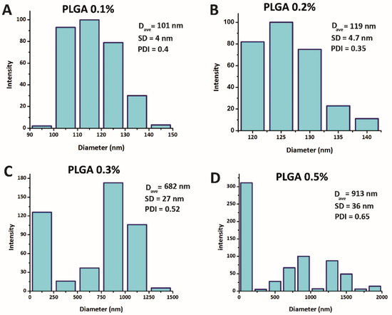 NPs size and their size distribution curves based on dynamic light scattering (DLS) at different PLGA concentrations: (A) 0.1 (% w/v), (B) 0.2 (% w/v), (C) 0.3 (% w/v) and (D) 0.5 (% w/v). (The p-value for all data was less than 0.05).