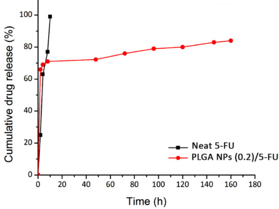 In vitro release profiles of neat 5-FU and PLGA NPs (0.2)/5-FU during 165 h.