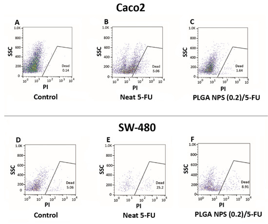 Flow cytometry results for Caco2 cell line: (A) control, (B) neat 5-FU and (C) PLGA NPs (0.2)/5-FU, besides for SW-480 cell line: (D) control, (E) neat 5-FU and (F) PLGA NPs (0.2)/5-FU.