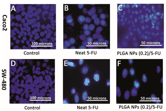 Representative fluorescence micrographs (DAPI, blue) showing morphologically death of Caco2 and SW-480 cell lines after DAPI staining: (A,D) control [magnification 200×], (B,E) neat 5-FU and (C,F) PLGA NPs (0.2)/5-FU [magnification 400×].