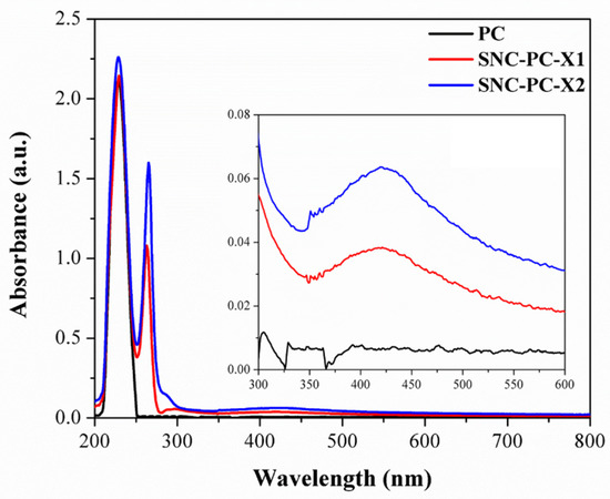 The UV-Vis spectrum for 2-weight % solution of 4-pyridyl cholesterol (PC) in THF shows a strong noticeable absorption peak. The most intense absorption, occurring at approximately 190 nm, is related to the π–π* transition for the peptide bond. In the case of SNC-PC-X1 and SNC-PC-X2, however, the lower energy transitions are profoundly dominating, in addition to a characteristic surface plasmon resonance (SPR) peak for SNPs. The lower energy transition, occurring at 265 nm, corresponds to the π–π* transition in the aromatic portion of pyridine moiety (see Figure 2). The inset figure shows a strong SPR peak flanked at 420 nm, due to free-electrons excitation, and their collective oscillations were detected via the Kretschmann configuration [43]. However, it can be noticed that the SPR band is absent in the case of PC.