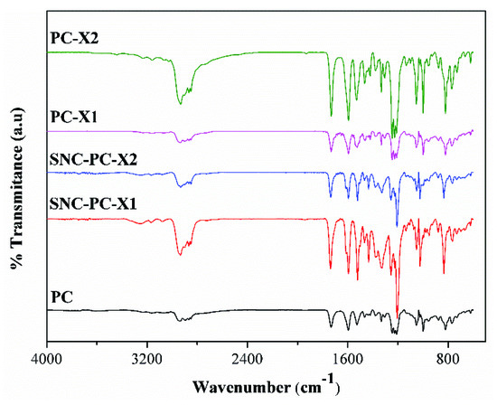 FTIR spectra of PC, PC-X1, PC-X2, SNC-PC-X1 and SNC-PC-X2.