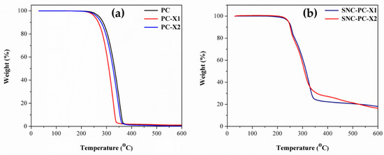 (a) TG plot of PC and xerogels (PC-X1 and PC-X2); (b) TG plot of xerogel silver nanocomposites (SNC-PC-X1 and SNC-PC-X2), under N2 gas at a heating rate of 10 °C/min.
