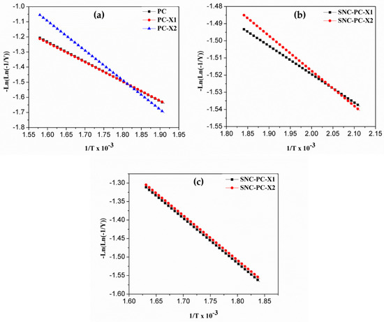Plots of –Ln(ln(-1/y)) vs 1/T×10-3 (a) for the decomposition step of PC, PC-X1 and PC-X2 in the range 250–360 °C; (b) for the first decomposition step of SNC-PC-X1 and SNC-PC-X2 in the range 200–270 °C; and (c) for the second decomposition step of SNC-PC-X1 and SNC-PC-X2 in the range 270–340 °C.