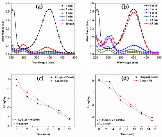 Time-dependent UV-Vis spectra representing the catalytic reduction of 4-NP into 4-AP using (a & b) nanocatalyst SNC-PC-X1 and SNC-PC-X2, respectively; and linear plot of –ln(At/Ao) versus reduction time for (c & d) nanocatalyst SNC-PC-X1 and SNC-PC-X2, respectively.