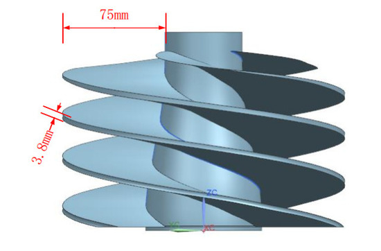 In this research, typical titanium alloy thin-walled parts were selected for machining, as shown in Figure 1. The size of the workpiece blank was φ 210 mm × 200 mm, and the accuracy requirements for the outline dimensions were ±0.30 mm. The workpiece was composed of three complex helix surfaces, the blade overhang depth was 75 mm, the wall thickness at the thinnest part was 3.8 mm, and the ratio of the depth to thickness exceeded 19 (as expected for a typical thin-walled part) [24]. In the machining process, the metal removal rate was as high as 80%. The chemical composition of the titanium alloy is shown in Table 1 and the physical and mechanical properties are shown in Table 2.