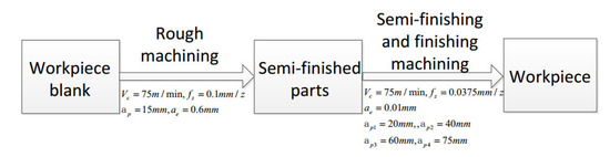 In order to ensure the machining efficiency and precision of the workpiece, the cutting process parameters and processing technology should be as reasonable as possible. A five-axis CNC milling and one-time forming process scheme without auxiliary support were proposed to reduce the positioning errors caused by multiple clamping during the cutting process in this study. The process flow of this experiment entailed roughing, semi-finishing, and finishing. According to the process planning, the appropriate cutting parameters were selected to ensure that the desired workpiece shape was obtained after each processing step. The process flow chart is shown in Figure 2.