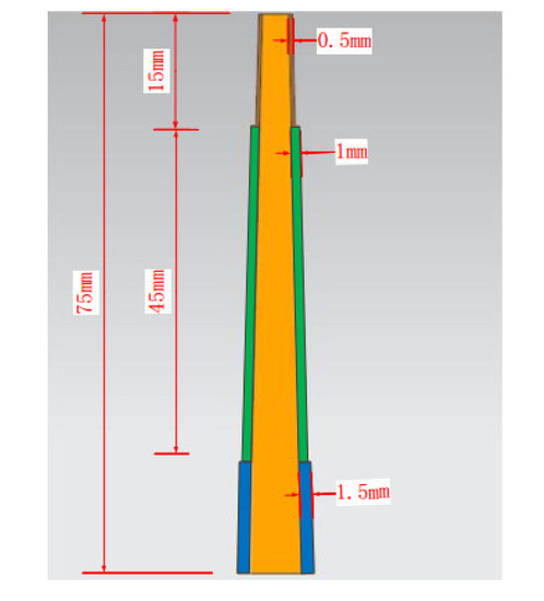 In the rough machining stage, a cutting depth of 15 mm was selected based on the overhang depth of the workpiece, which was 75 mm, and the workpiece was processed in 5 steps. After processing, three stepped profiles were formed, as shown in Figure 3: with a unilateral allowance of 0.5 mm and depth of 15 mm; a unilateral allowance of 1 mm and depth of 45 mm; and a unilateral allowance of 1.5 mm and depth of 15 mm. In this figure, the yellow part is the ideal interface shape of the blade and the other parts are the machining allowance left after processing was completed, which was convenient for semi-finishing and smooth finishing.
